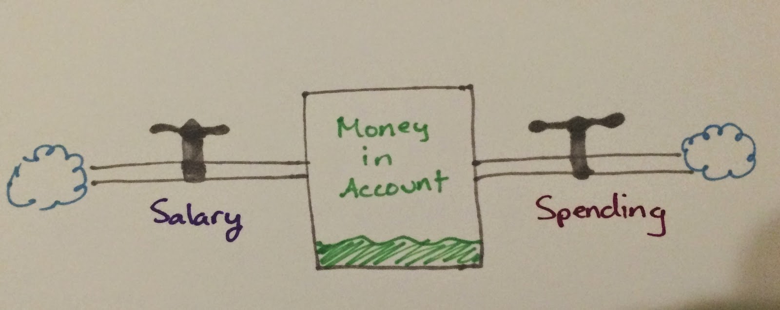 Stocks don't change directly; they grow or shrink over time according to the rates of flow. If your salary grows while spending stays constant, money accumulates in your account. Flows are affected by changes to the rules of the system, and sometimes by the levels in each stock. The more money in your bank account, the faster you spend it, perhaps. When a flow affects a stock and that stock affects the flow, a feedback loop happens, and then things get interesting. If the more money in your bank account, the more you invest, and then the more money in your bank account... $$$$$!