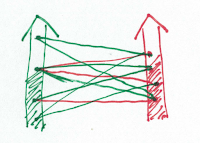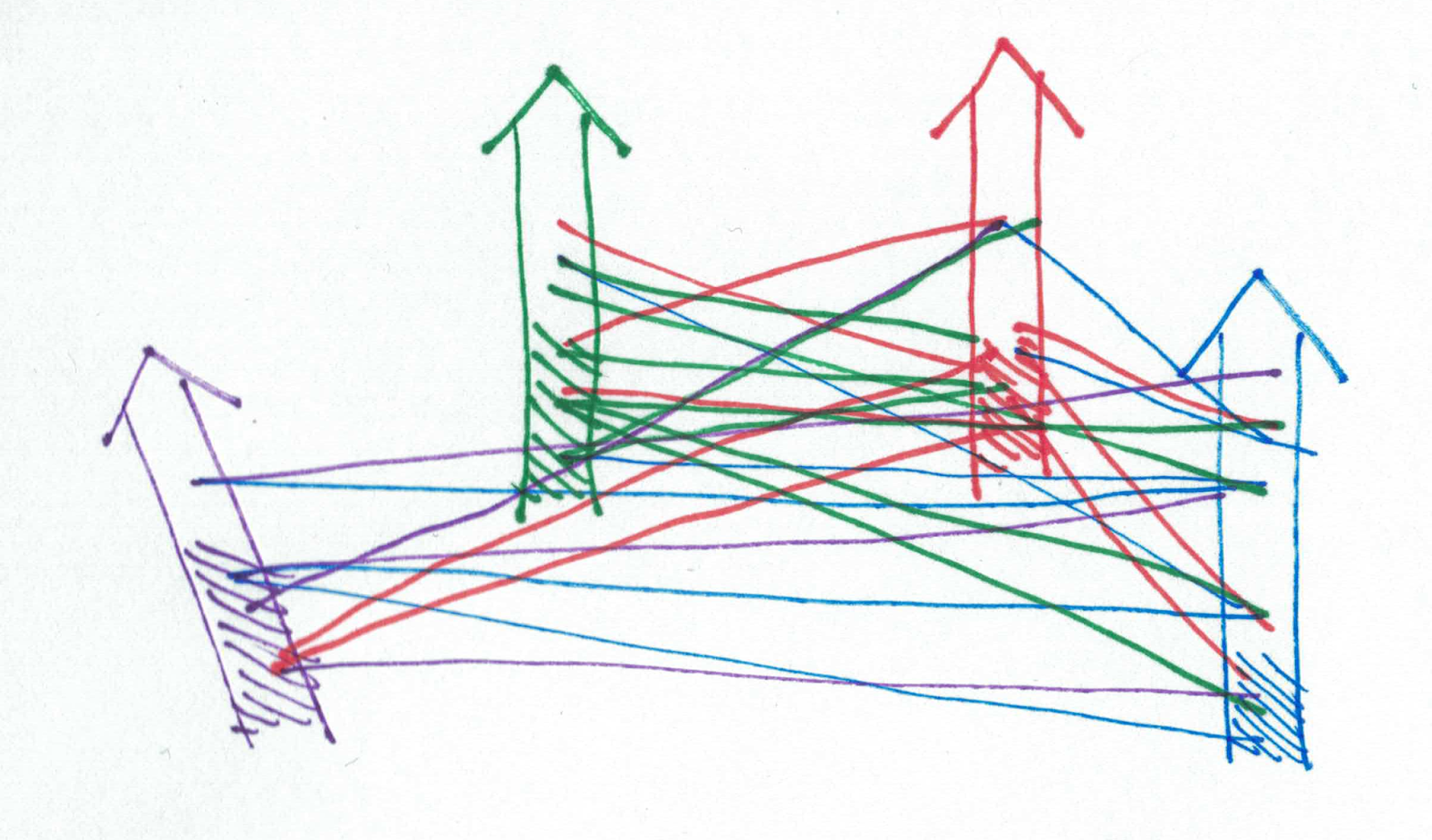 A purple arrow and a blue arrow join the red and green ones. Lines crisscross between them, a snarly web. The arrows are filled only a little because of these coordination costs. The purple arrow is less connected, and a bit more full, but it's pointed thirty degrees to the left.